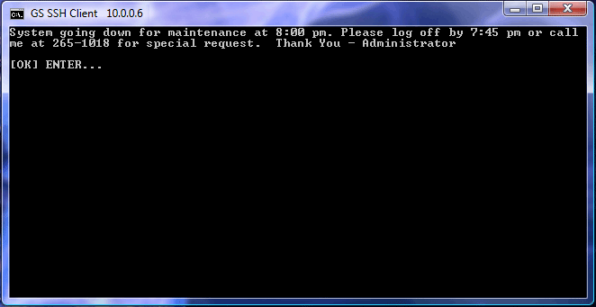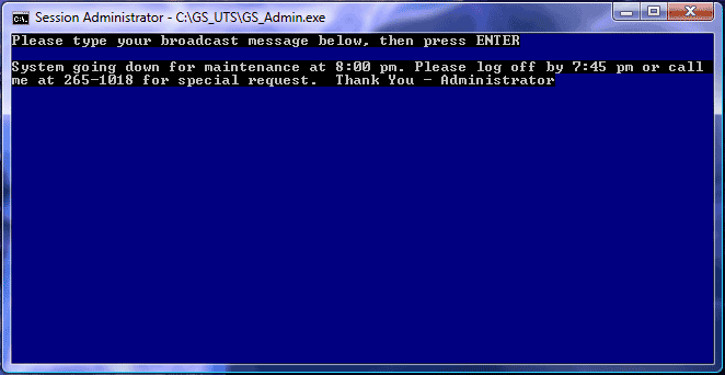 The GSW Broadcast utility allows you to send a message to ALL active SSH2/Telnet sessions or to a specific session. You can identify the specific SSH2/Telnet session by User Name and/or IP Address. The text of the message that is sent is specified in an ASCII text file.