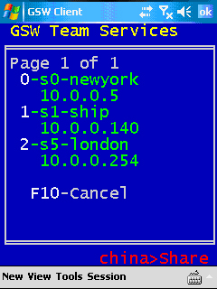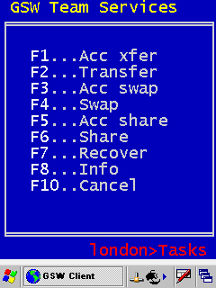 Tom takes the wireless mobile device and connects creating a temporary session. Tom enters Team Services on his wireless mobile device and presses F6 to initiate the Share task(Figure 77). The list of sessions in Accept Share mode is shown(Figure 78). Tom sees s5 is listed by the number 2. He presses 2 to join session s5. Tom's mobile device is now connected to the same session as the truck mount device. The result is shown in Figure 79