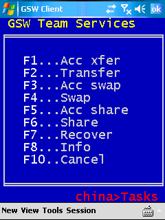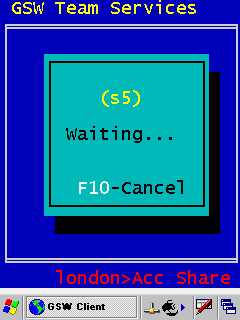 Tom obtains the wireless mobile device. He is already connected with his truck mount device. Tom wants to allow his truck mount device session to be shared. From the truck mount device he enters Team Services (Figure 75) and then initiates the task Accept Share by pressing F5. The truck mount device display shows his session id is “s5” and waiting for a partner(Figure 76).