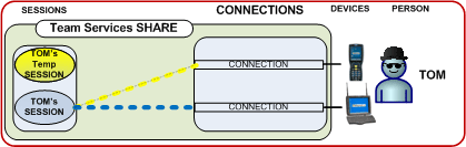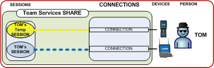 In the diagram below we have two devices and one person - Tom. Tom's device is a truck mount device. He is the only one working in the warehouse today and also wants to have a wireless mobile device to scan items his truck mount device cannot reach. Tom needs all his work be in a specific session and he does not want to log on and off each time he uses each device. Tom can use the TS Share feature and have two devices connected to the same session. With each scan he can use the most convenient device