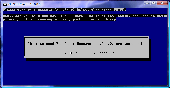 Selecting will send the broadcast message to SSH2/Telnet user doug. Selecting will abort the broadcast message. The message will be displayed on the client terminal similar to the figure below.