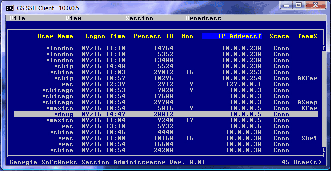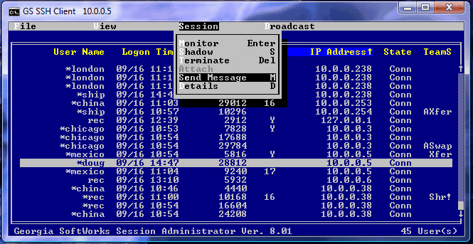 In the case above we are selecting the user name “doug” to send the broadcast message. Once we have selected the user then we select the Session menu either by entering or clicking the menu item Session. This will display the drop down which contains the item Send Message (See Figure 112 ).