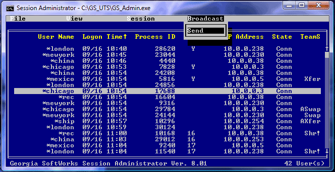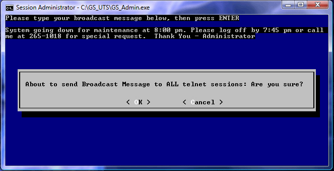 The GSW Broadcast utility allows you to send a message to ALL active SSH2/Telnet sessions or to a specific session. You can identify the specific SSH2/Telnet session by User Name and/or IP Address. The text of the message that is sent is specified in an ASCII text file.